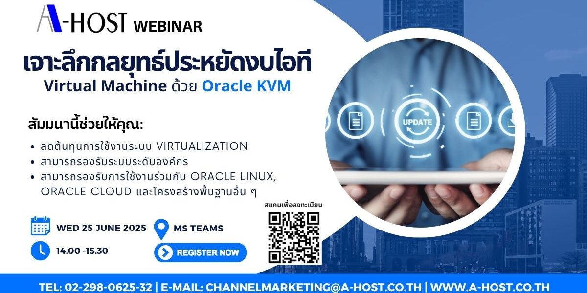 บริษัท A-HOST จำกัด ขอเรียนเชิญท่านเข้าร่วม Webinar หัวข้อ “เจาะลึกกลยุทธ์ประหยัดงบไอที Virtual Machine ด้วย Oracle KVM” แนะนำทางเลือกใหม่ที่มีความคุ้มค่า พร้อมประสิทธิภาพในระดับ Enterprise ซึ่งช่วยให้องค์กรสามารถ: